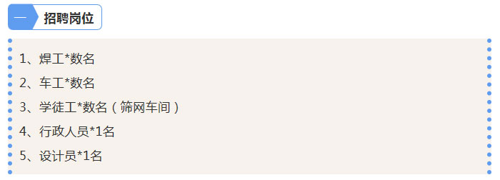因公司擴大生產、新建大型車間,新增不銹鋼篩網生產線,現面向社會招聘人才,具體如下: