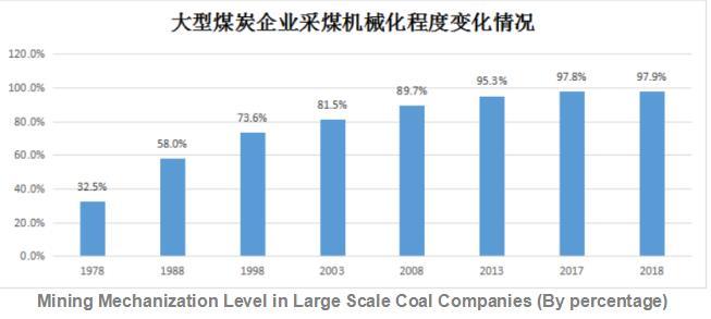 煤炭生產方面,從1978年至2019年,大型煤炭企業采煤機械化程度由32%提高到96%;全國煤礦人均生產效率由137噸/年提高到1000噸/年;建成了年產120萬噸及以上的大型現代化煤礦1200處左右,煤炭產量占全國的80%以上;建成了千萬噸級煤礦42處,產能6.7億噸/年。