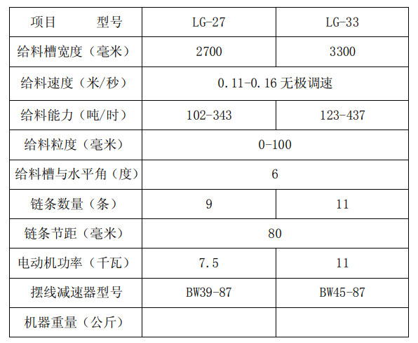 一、設備用途 LG 型鏈式給料機適用于煤炭、水泥、冶金和化工等待業為粒級為 0-100 毫米至混合松散物料的輸送設備。在選煤廠是與跳汰機相配套 使用的給煤設備。
