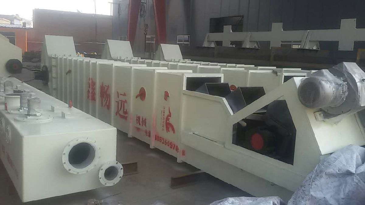 工作原理: 由傳動裝置提供動力給鏈輪軸,通過連接在鏈輪軸上頭輪的轉動,帶動由兩根鏈條和料斗組成的斗鏈。料斗由鋼板制成,其上交錯排列著脫水用的長孔,在經過存有物料的尾部時,料斗挖取物料,在星輪帶動斗鏈無極轉動的過程中,完成物料的脫水、運輸及卸料。